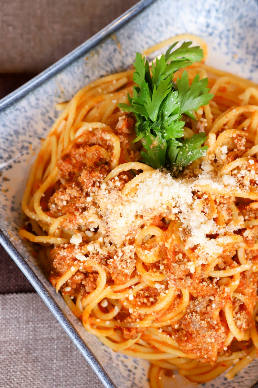 100 gr kıyma, soğan sarımsak, havuç, domates sosu, salça, baharat, parmesan peyniri.