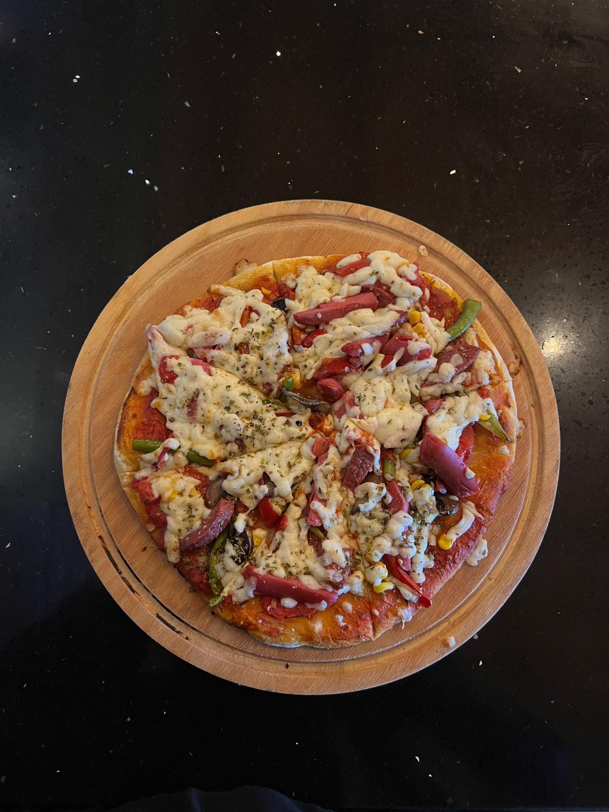 Sosis, sucuk, mozarella, mısır, zeytin, kapya ve yeşil biber, mantar,mısır, çeri domates, domates sosu, kekik.