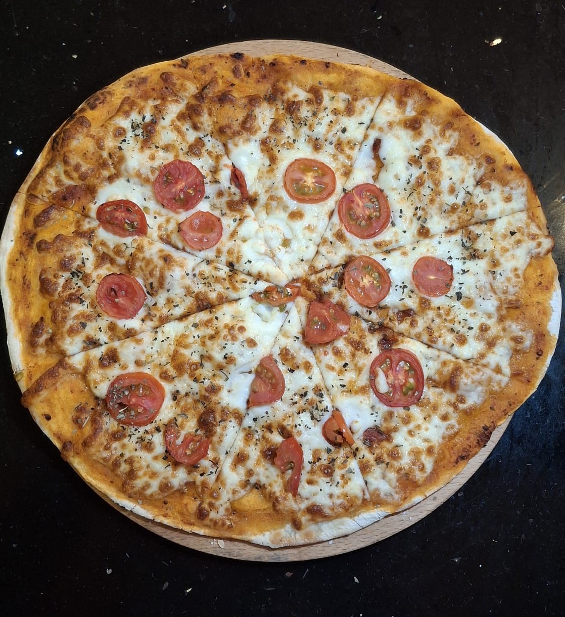 Mozarella, mantar, mısır, kapya ve yeşil biber, çeri domates, zeytin, beyaz peynir, domates sosu, kekik.